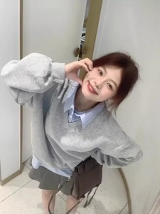 韩系学院风假两件polo领卫衣女春秋设计感宽松慵懒风套头休闲上衣