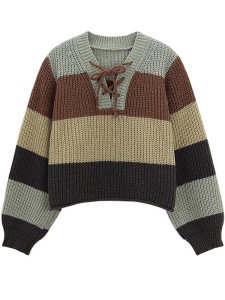 条纹撞色系带针织毛衣女秋冬2025新款设计感V领短款长袖上衣