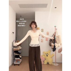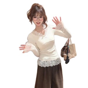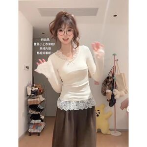 法式甜美风蕾丝拼接V领长袖T恤早秋新款修身显瘦纯欲别致打底上衣