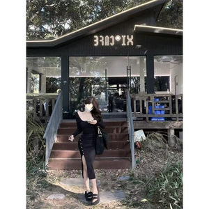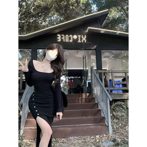 2025秋季纯欲漏腿方领辣妹长袖连衣裙多巴胺修身开叉收腰显瘦打底