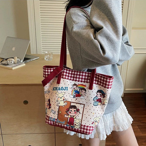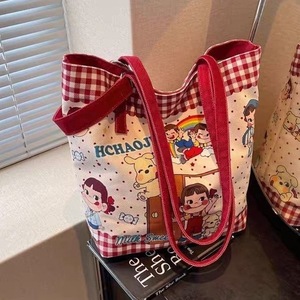 可爱卡通帆布包包女2025新款大容量单肩水桶包小众休闲百搭托特包