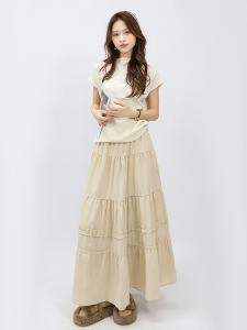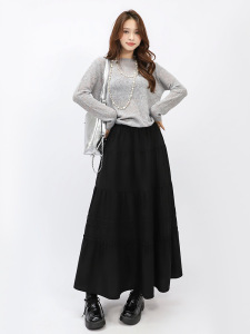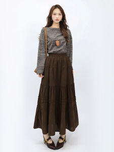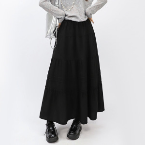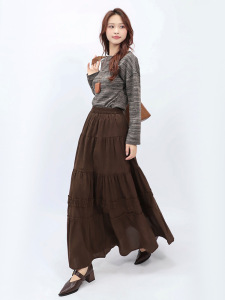 菲媛纯色花边拼接A字裙女 秋冬新款时尚百搭显瘦咖色中长款半身裙