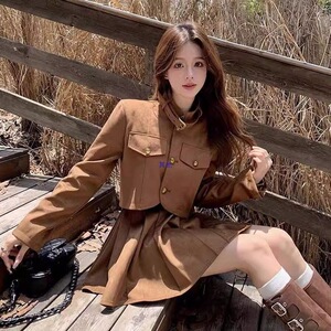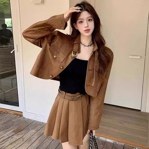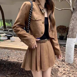 复古时尚套装春秋季新款仿鹿皮绒长袖咖色外套高腰百褶短裙两件套