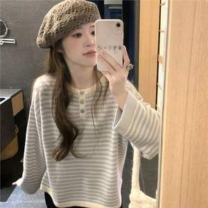 蕾朵撞色条纹长袖针织衫上衣女新款秋季慵懒休闲套头毛衣内搭
