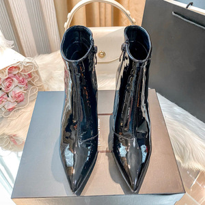 字母跟瘦瘦鞋女2025新款法式高跟侧接链短靴尖头细跟漆皮时尚女靴