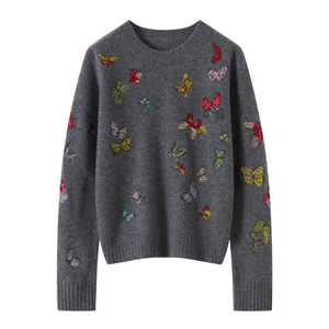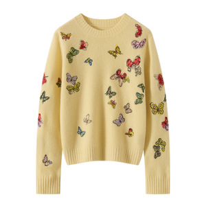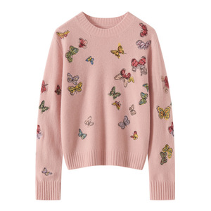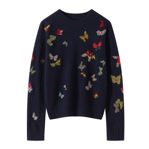 羊绒羊毛混纺圆领针织衫女式长袖打底秋冬新款刺绣蝴蝶设计毛衣衫