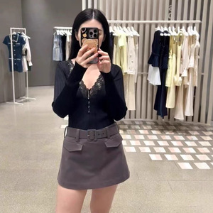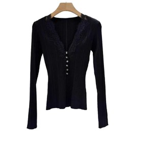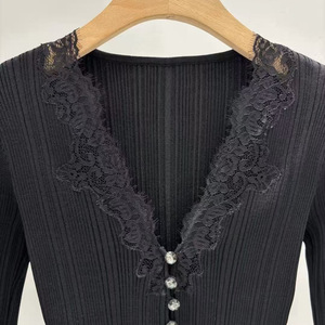 法式小众2025秋季经典黑色蕾丝拼接V领长袖针织衫上衣女