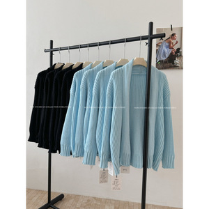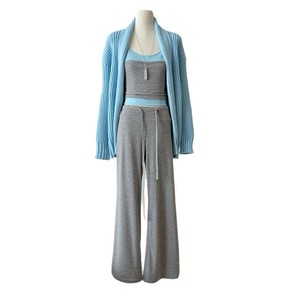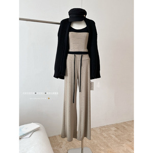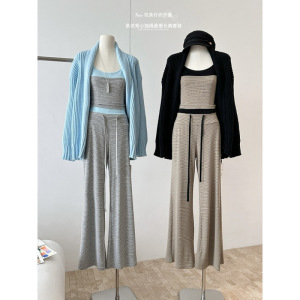 秋上新!坑条针织长袖外套女内搭条纹背心抽绳垂感长裤套装