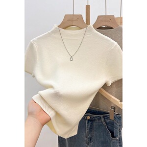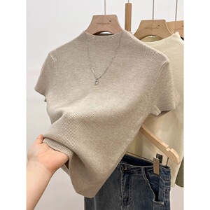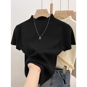 夏季半高领黑色修身显瘦上衣正肩短袖春夏新款小个子气质针织短袖