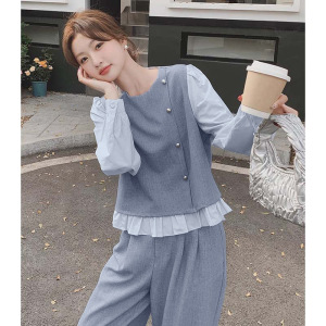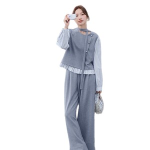 韩系气质高级感小香风套装女秋季2025新款假两件上衣阔腿裤两件套