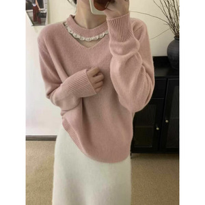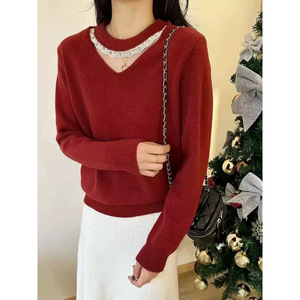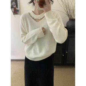 韩系蕾丝拼接镂空毛衣套头女2025秋冬新款气质高级感温柔风针织衫