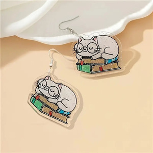 跨境新款猫咪趴在书本上面睡觉卡通耳饰平面亚克力可爱猫咪耳环
