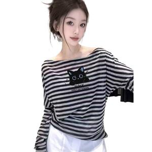 韩版黑色条纹一字领长袖t恤女春秋2025新款宽松洋气减龄百搭上衣