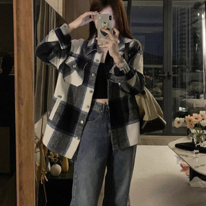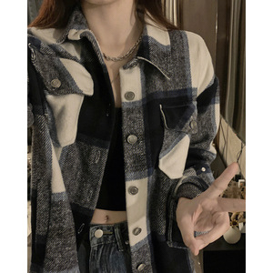 秋冬港风加厚磨毛格子衬衫女设计感小众宽松慵懒衬衣外套夹克上衣