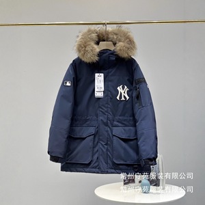 高版本MLB男女百搭连帽羽绒服大毛领 情侣中长款加厚防水工装批发