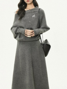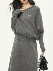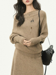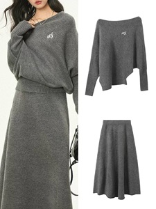 WESTAYONE秋季新款休闲针织上衣女斜肩两件套装一字肩+半身裙