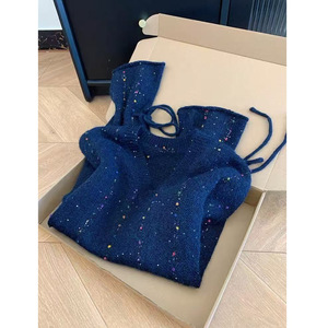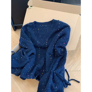 藏蓝色喇叭袖复古v领套头长袖宽松外穿毛衣女慵懒风高级感上衣ins