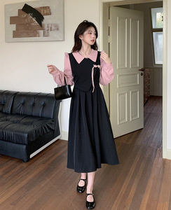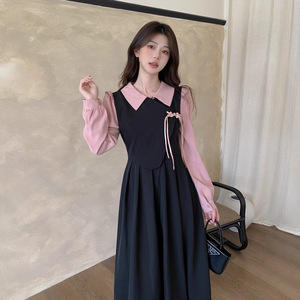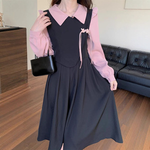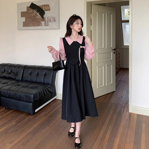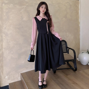 大码女胖mm赫本风法式拼接假两件长袖连衣裙秋季遮肚收腰显瘦长裙