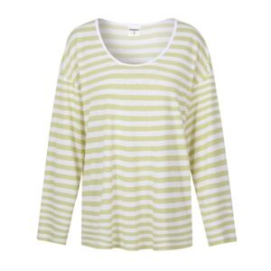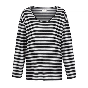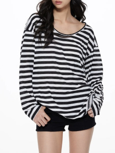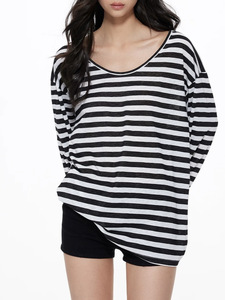 UnderStress 慵懒风黑白条纹V领薄款长袖罩衫t恤衫圆领上衣夏早秋