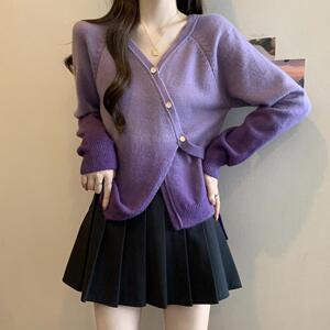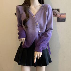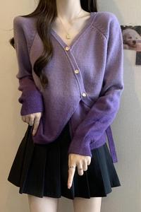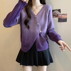 设计感渐变紫色V领针织衫毛衣大码女装2025秋胖mm不规则收腰上衣