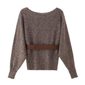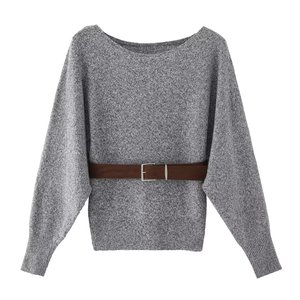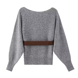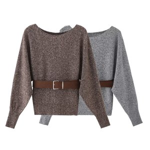 2451-25秋季新款 法式御姐风斜肩一字领蝙蝠袖系腰带收腰针织毛衣