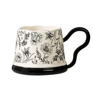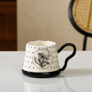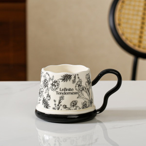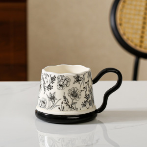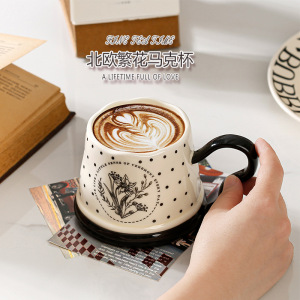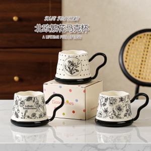 北欧风复古黑繁花系咖啡杯精致家用陶瓷水杯伴手礼送礼马克杯批发