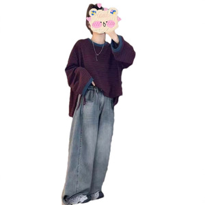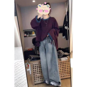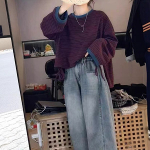 慵懒松弛感时尚套装女秋装宽松显瘦遮肉撞色条纹上衣牛仔裤两件套