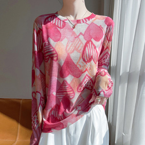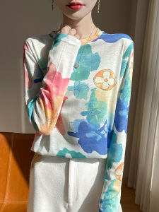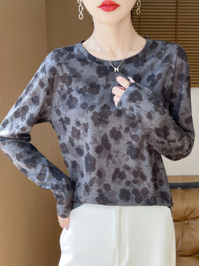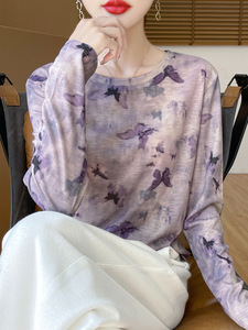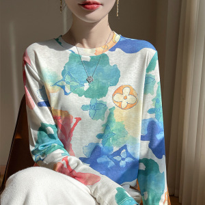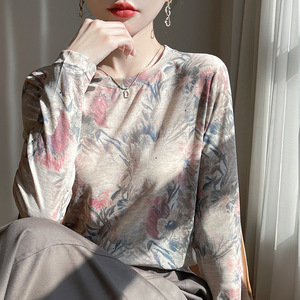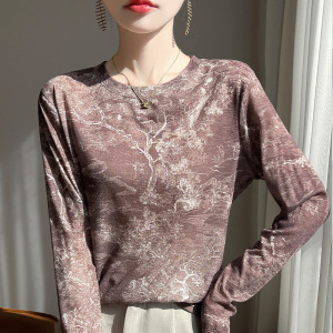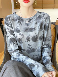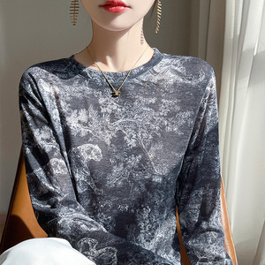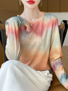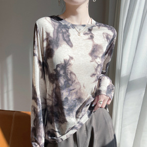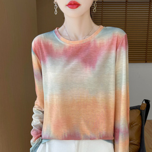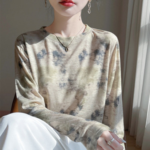 跨境莱赛尔天丝2025秋季女士扎染短款休闲圆领长袖打底衫毛衣百搭