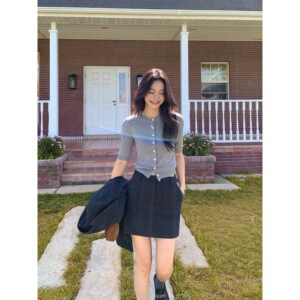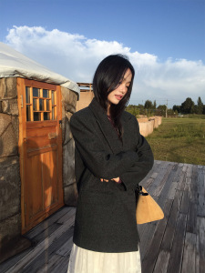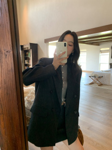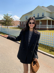 pusumede 格雷系西装外套女双排扣高阶质感西服+毛呢半身裙两件套