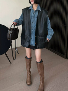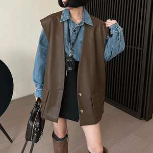 马甲女2025秋季新款时尚休闲港风纯色PU皮V领百搭中长款显瘦马夹