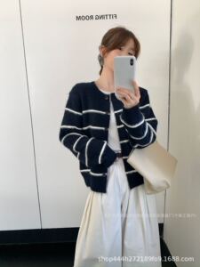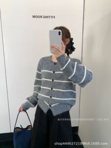 温柔风休闲条纹圆领软糯百搭针织开衫女秋季2025新款宽松毛衣外套