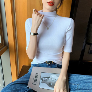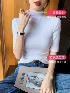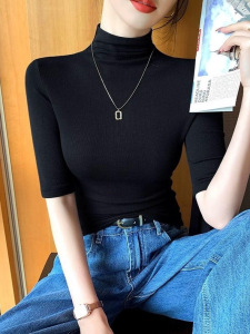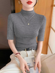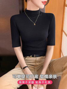 半高领中袖t恤女打底衫内搭2025新款春秋冬修身高级五分半袖上衣