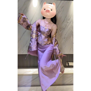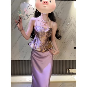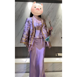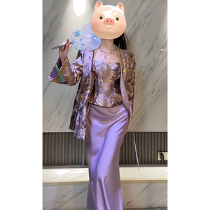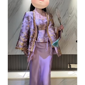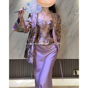 新中式国风套装超好看复古紫色雕花外套吊带半裙三件套秋