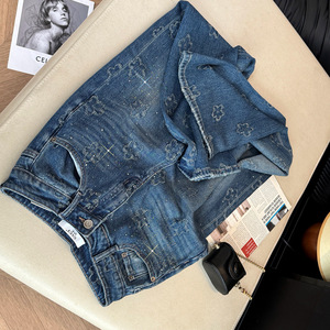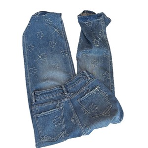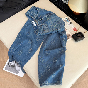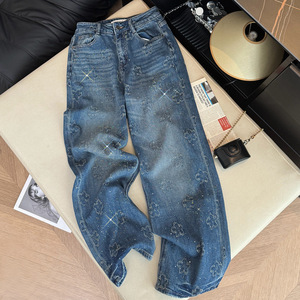 蓝色花朵刺绣烫钻高腰直筒牛仔裤女设计感复古休闲阔腿长裤子2025