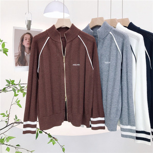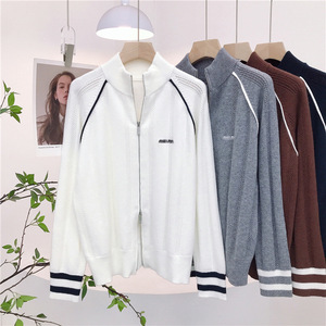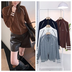 8219缪感撞色拉链外套秋冬季半高领插肩袖刺绣字母镂空双拉链开衫