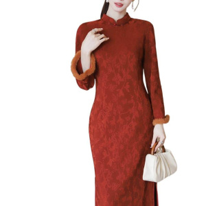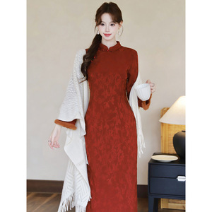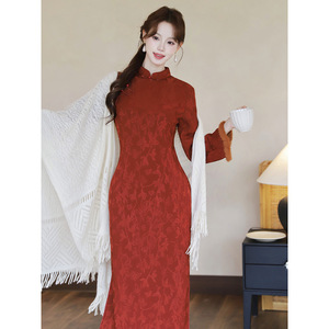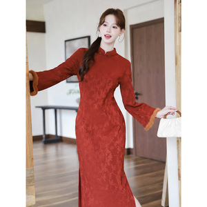 新中式国风复古加绒加厚保暖改良旗袍长袖秋冬日常可穿红色连衣裙
