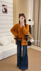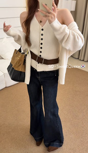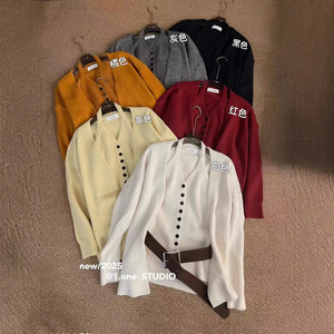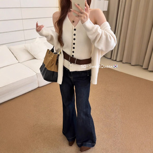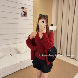 秋冬慵懒风韩版挂脖背心单排扣上衣+针织开衫毛衣两件套配腰带女