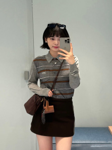 2025早秋新款学院风撞色条纹翻领长袖针织衫女修身显瘦polo领开衫