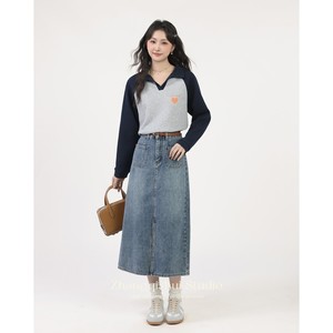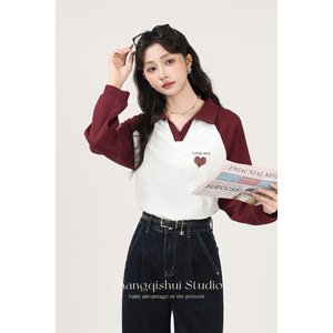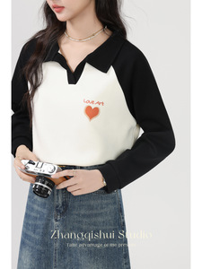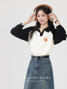 张汽水2025秋季新款黑色polo短款t恤卫衣女小众拼接撞色长袖上衣