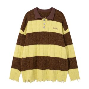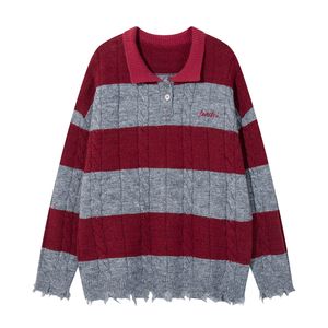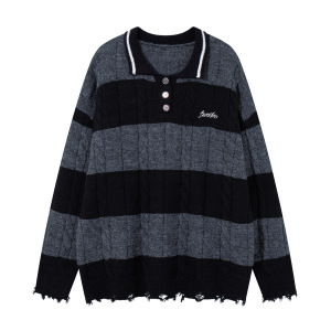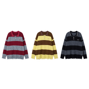 美式潮牌字母刺绣条纹翻领毛衣男女秋冬宽松休闲潮流针织衫上衣