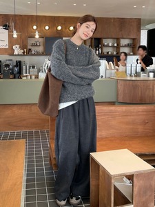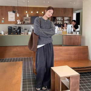韩系灰色浣熊绒圆领套头毛衣女秋冬季高级感外穿宽松针织衫上衣厚