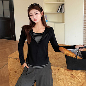 条纹拼接长袖T恤女春秋韩版2025新款设计感修身显瘦气质内搭批发