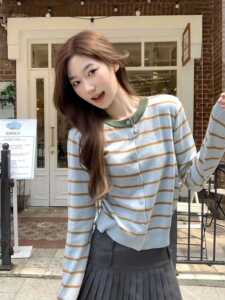 甜美慵懒风撞色条纹针织开衫女春秋新款小众宽松显瘦软糯毛衣外套
