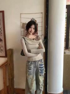 韩系设计感假两件长袖露肩t恤女秋季修身收腰高级感独特绝美上衣