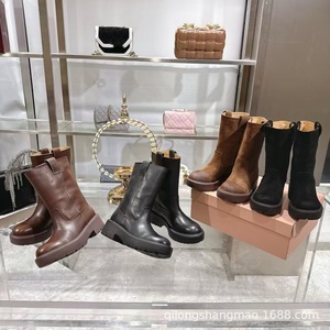 2025秋冬季新款麂皮圆头厚底做旧擦色复古骑士靴低跟中筒靴单靴女