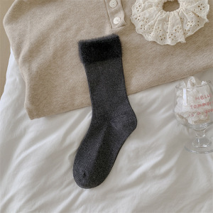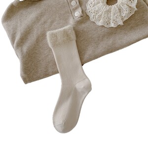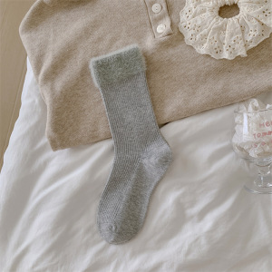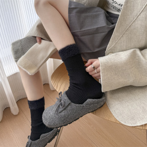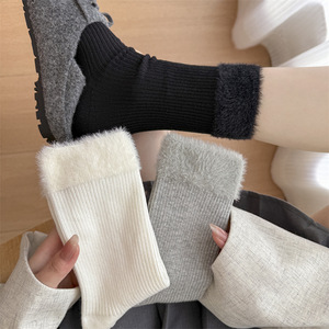 日韩秋冬新款无骨双针中筒袜毛绒罗口保暖百搭简约白色长筒堆堆袜