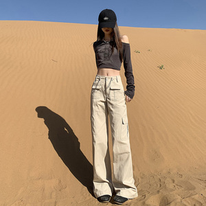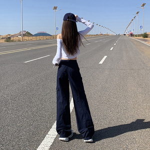 美式藏青色阔腿工装裤女秋季新款可调节腰设计感宽松直筒休闲裤子