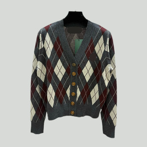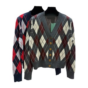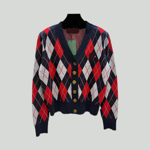 新款上市V+时髦星球恒星刺绣菱格线条撞色V领针织开衫气质修身女~