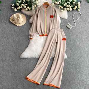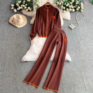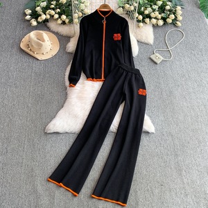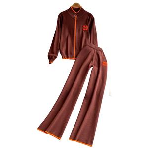 秋冬季小众撞色刺绣立领长袖外套+休闲高腰显瘦阔腿直筒裤套装