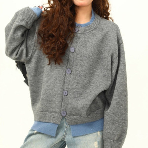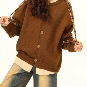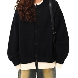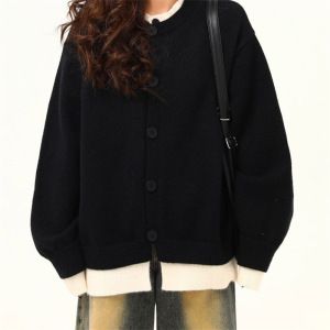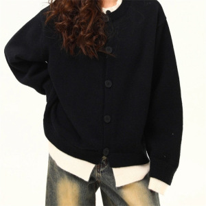 美式复古假两件针织开衫女秋冬新款韩系纯色宽松慵懒毛衣情侣外套